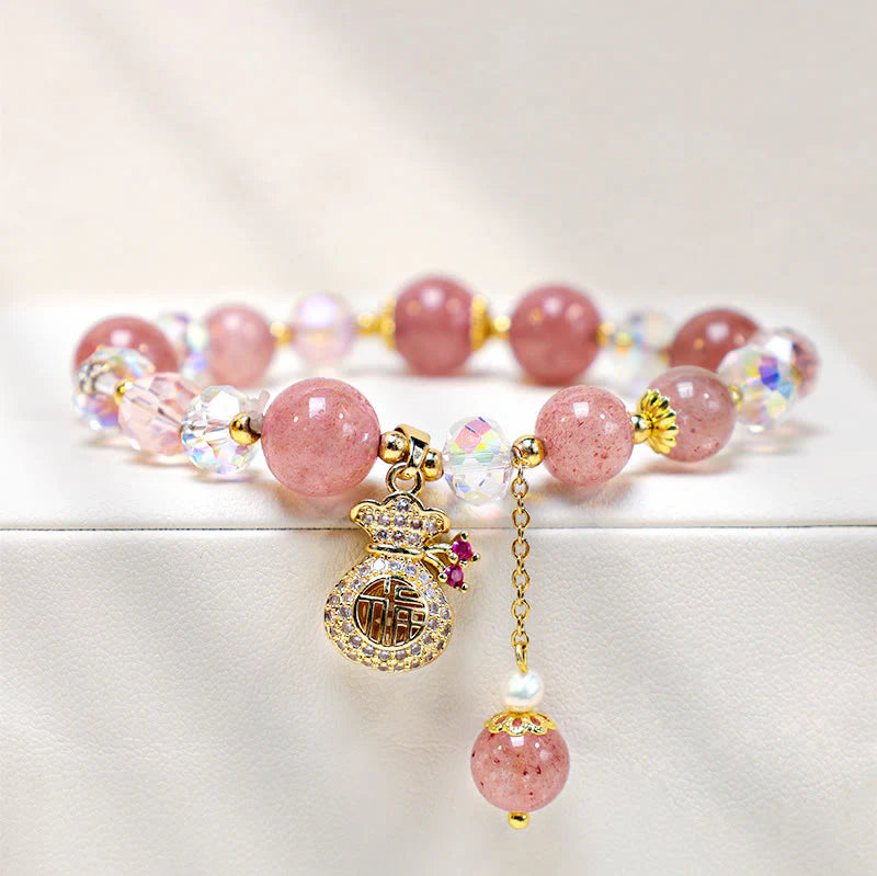 Bracelet Positif en Quartz Fraise Naturel — Charme Sac d’Argent, Amour & Guérison