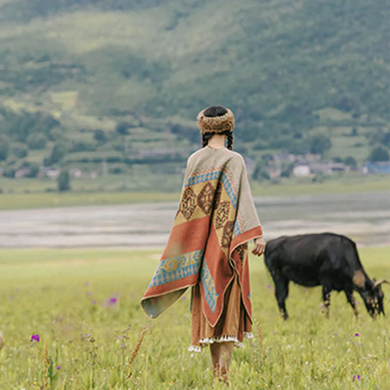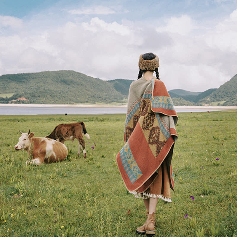 Châle Tibétain à Motif de Losanges – Écharpe Manteau Chaude d’Hiver